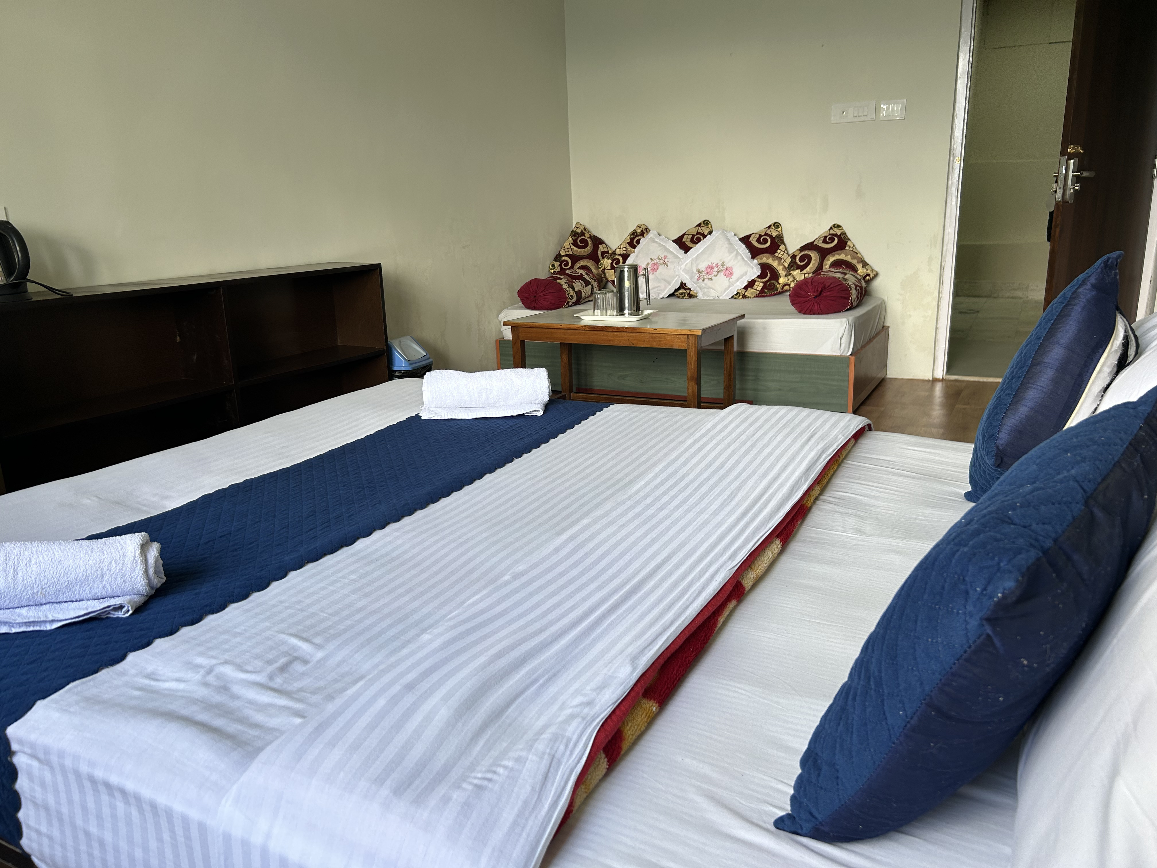 Our Deluxe (View) room balances comfort and value, adding a pleasing outlook from its view-facing window—perfect for slow mornings and unwinding after a day in Gangtok. The room offers extra space over Standard with a plush queen bed (fresh linens), seating by the window, a hot-and-cold shower, and consistent Wi-Fi. You’ll find a smart/LED TV, ample charging points, a work shelf, wardrobe/luggage rack, complimentary drinking water, and basic toiletries. Daily housekeeping keeps everything tidy; a fan/heater is provided as needed. Ideal for couples or solo travelers who want a nicer room and a better view—a step up in comfort without stepping up to the highest price bracket.